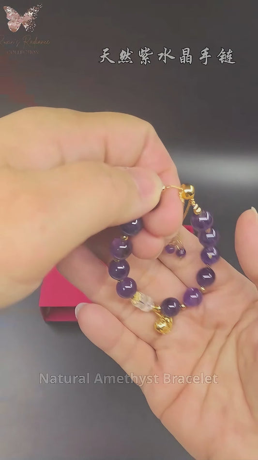 Natural Amethyst Charm Bracelet | Purple Crystal Beads with Clear Spacers & Gold Heart Charm | Adjustable Fit | Gelang Ametis Asli dengan Pesona Hati Emas|Boleh Laras|Hadiah Istimewa