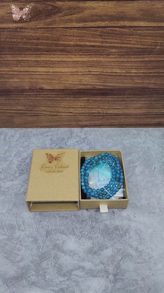 Natural Blue Apatite Triple Wrap Bracelet or Necklace with ocean-blue crystal beads | Gelang atau Rantai Apatite Biru semula jadi dengan reka bentuk lilitan tiga lapis