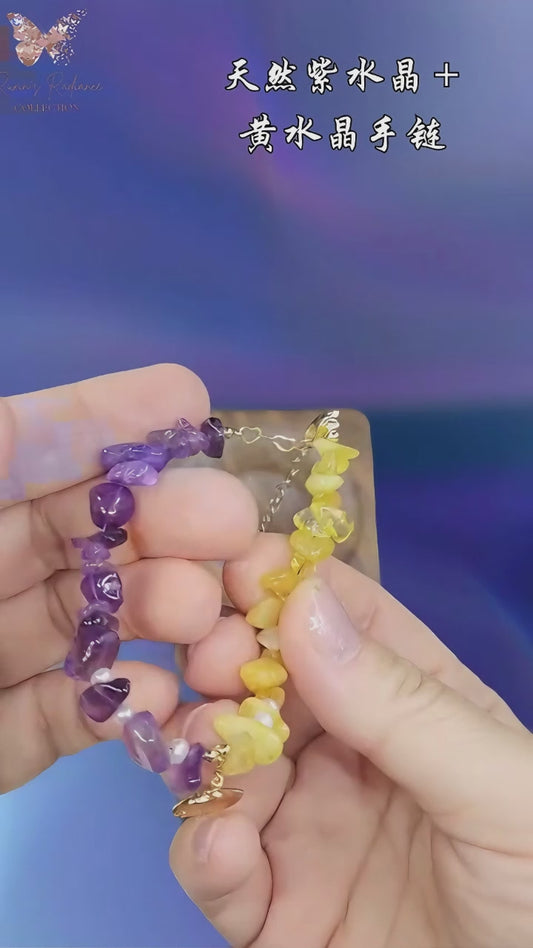 Amethyst x Yellow Quartz Natural Stone Bracelet with White Pearls & Gold Ginkgo Charm | Handmade Adjustable Crystal Jewelry | Gelang Ametis Kuarsa Kuning dengan Mutiara & Pesona Emas