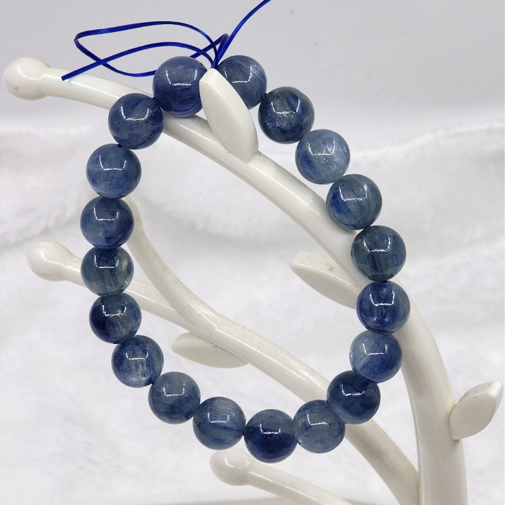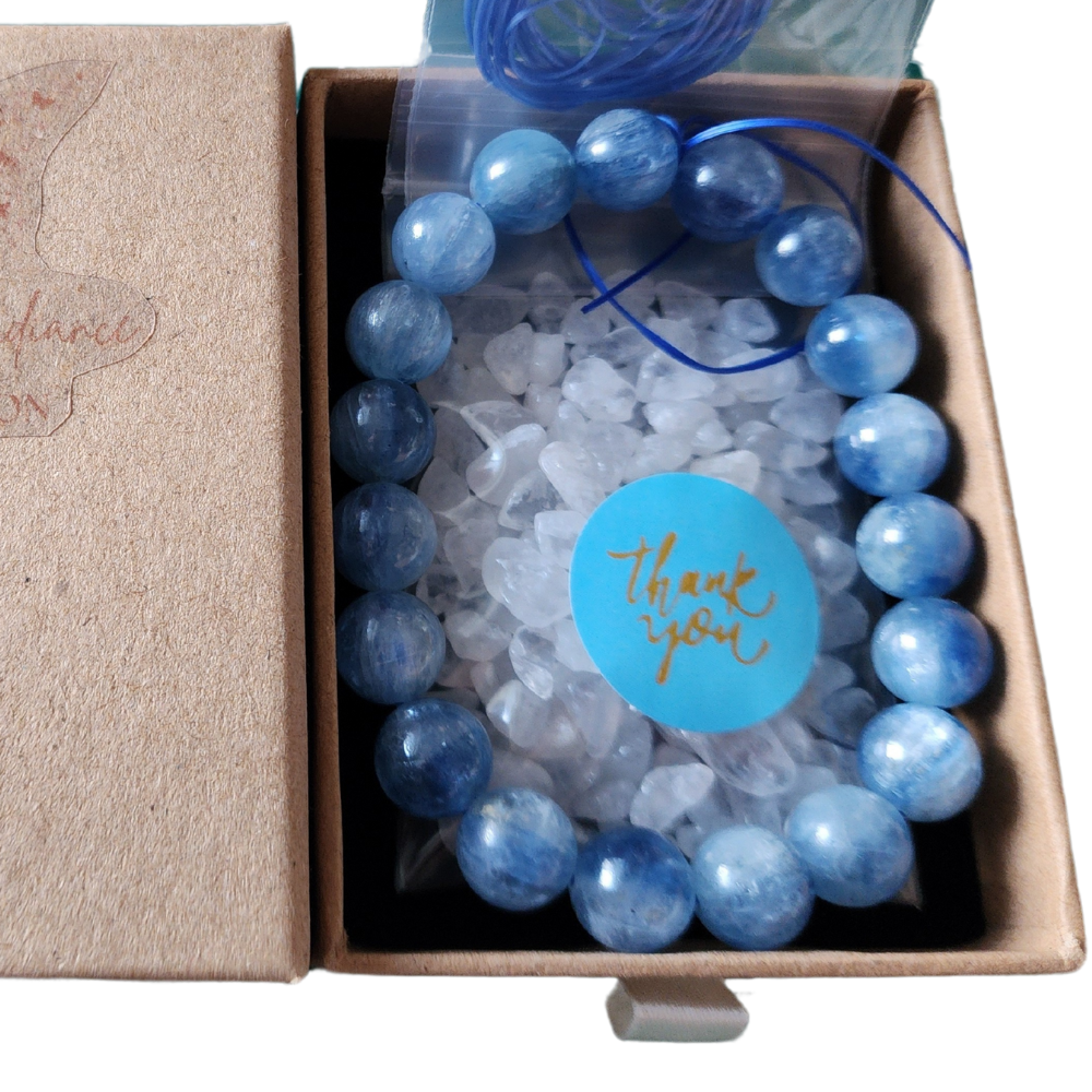 Diperbuat daripada Kyanite biru asli 100%, gelang ini dikenali sebagai “Batu Penyelarasan” untuk merangsang Cakra Tekak (komunikasi) dan Cakra Mata Ketiga (intuisi). Setiap manik mengekalkan corak alam—garisan perak, serat bulu, atau tekstur lutsinar—menonjolkan keindahan mentah Bumi.