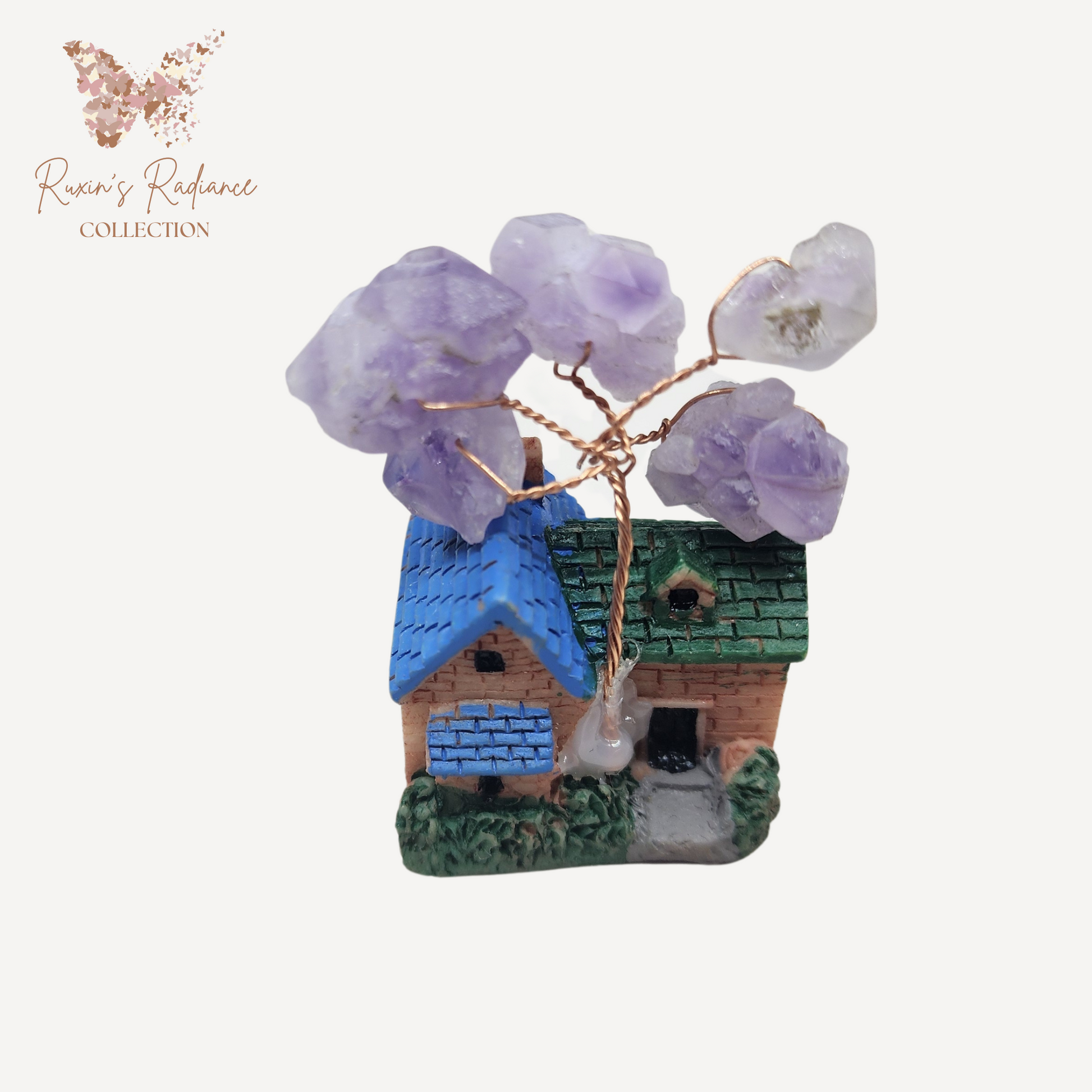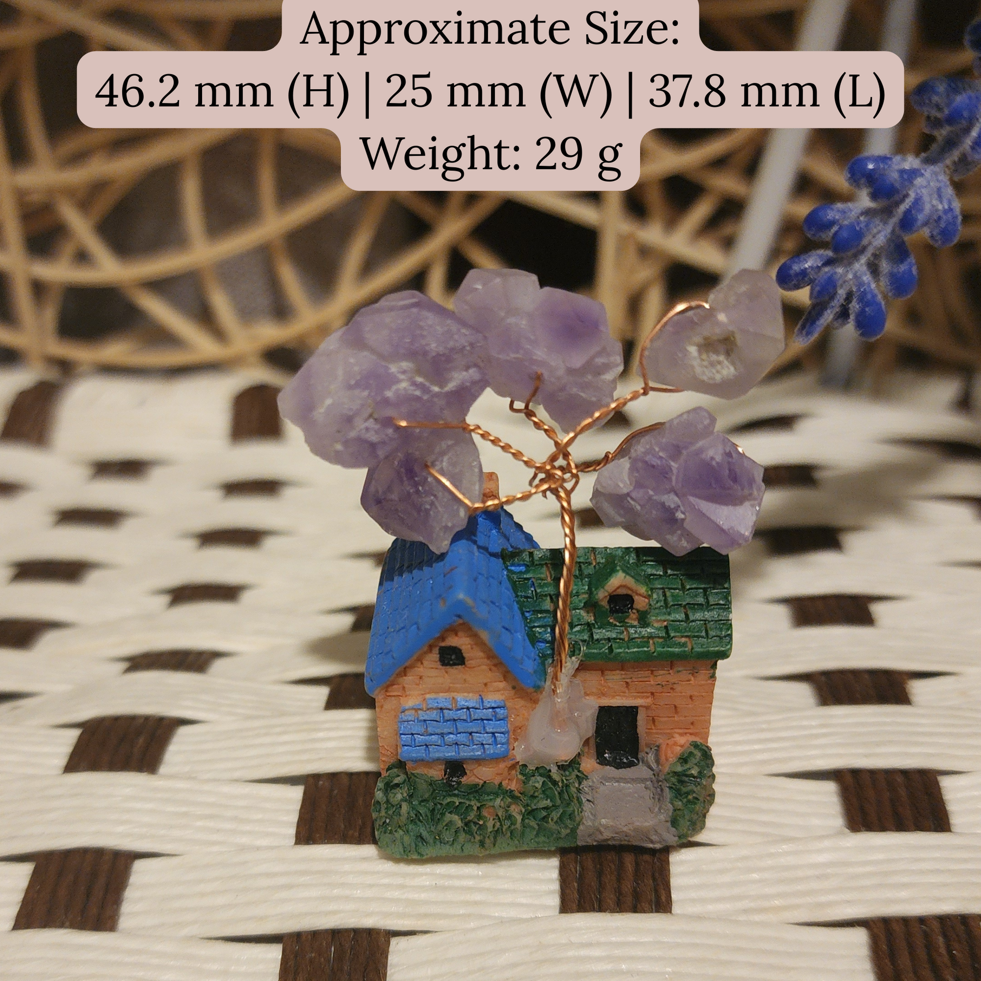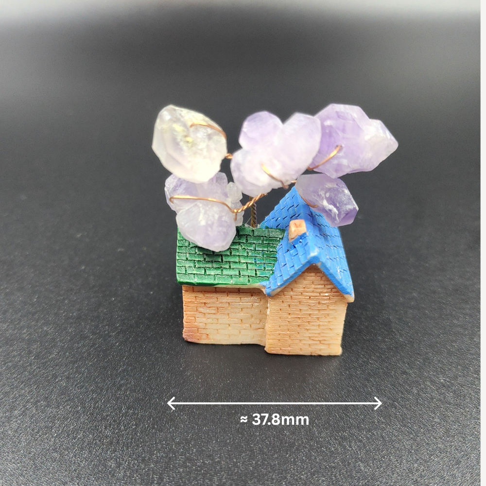 Enhance your space with the charm and tranquility of the Amethyst Crystal Tree House Decor. This beautifully crafted miniature features a detailed brick-walled house with a blue-tiled roof, accompanied by an elegant golden wire tree adorned with raw amethyst crystals. The tree's branches are fully adjustable, allowing you to reshape them freely based on your personal preference and feel. The soft purple hues of the amethysts radiate calming energy, making this piece a unique and soothing addition to any setting. Perfect for crystal enthusiasts and those who appreciate artistic decor, this handcrafted piece blends natural beauty with creative craftsmanship for a mesmerizing display.