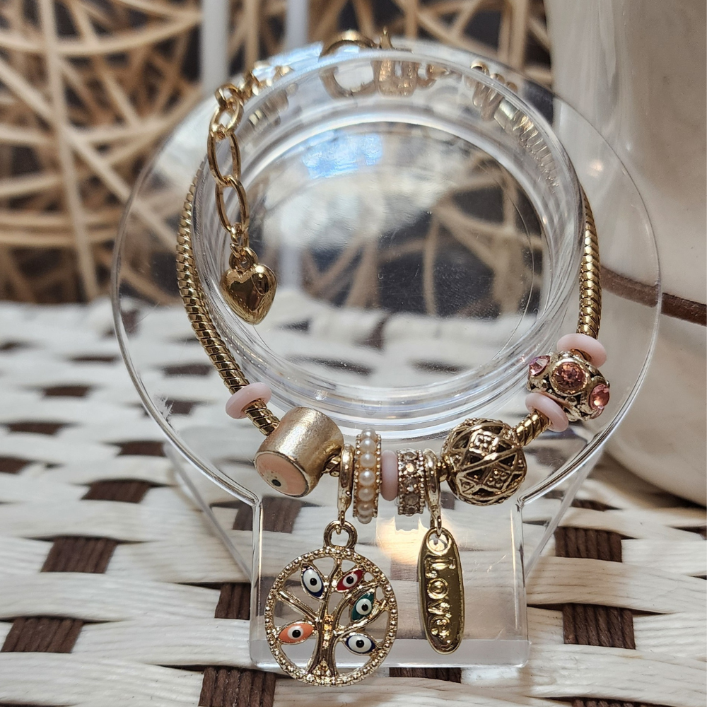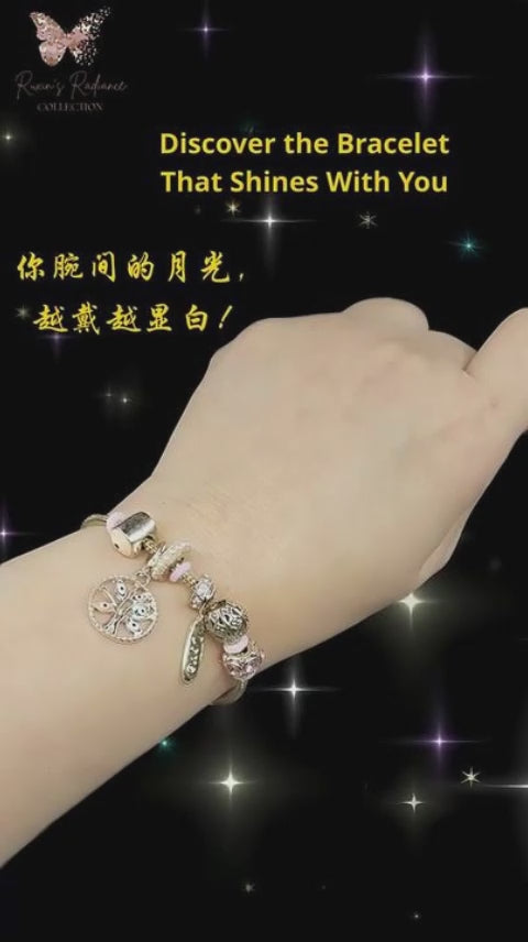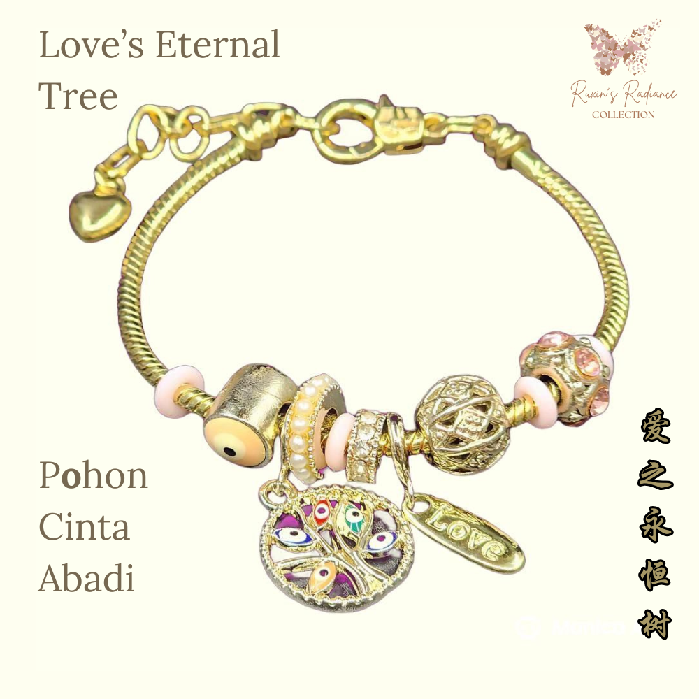 Ruxin Radiance Handmade Crystal Alloy Bracelet: Gold/Pink Tone, Tree of Life & Love Charm. 精美手链,爱之吊饰! Gelang Aloi Pokok Kehidupan & Azimat Cinta