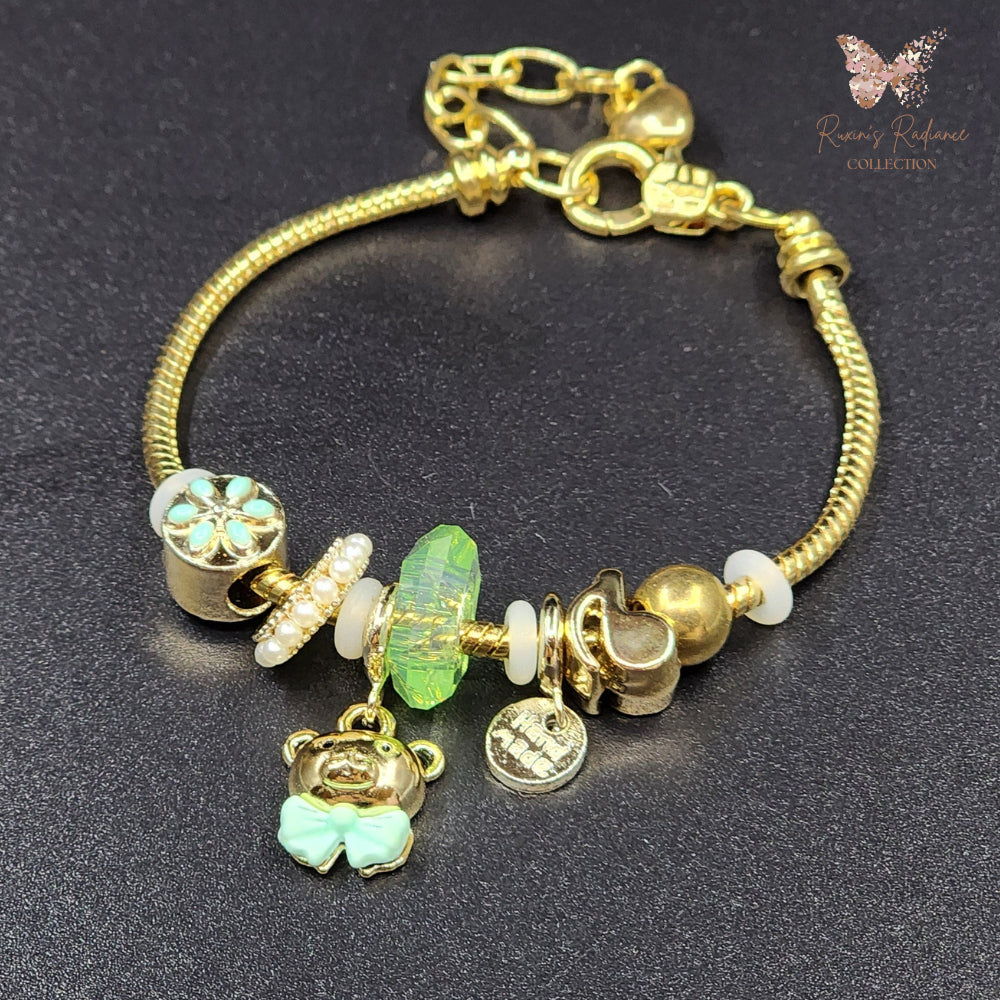 Ruxin Radiance Handmade Gold Alloy Bracelet – Bear, Flower & Heart Charms – Gift! 小熊花爱合金链 – 珠首选! Gelang Aloi Emas – C Beruang, Bunga, Hati